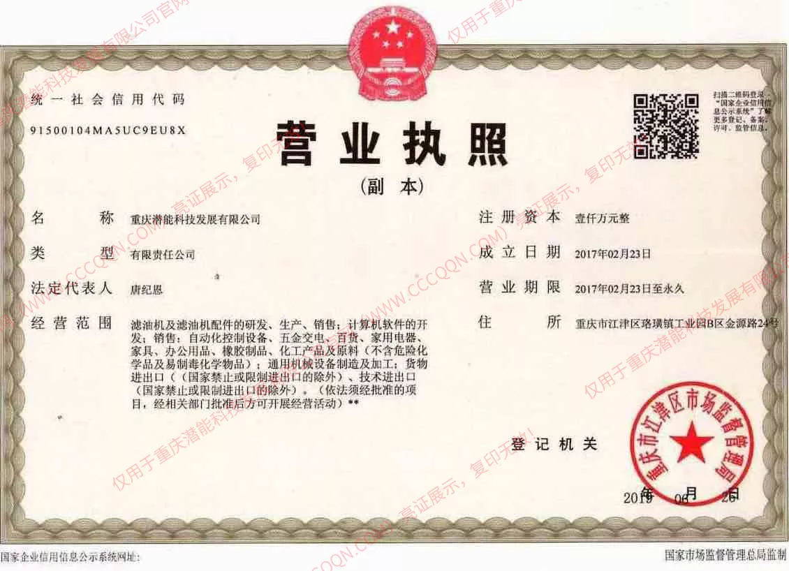 重庆市潜能科技发展有限公司,是一家专业设计、制造和销售各种油、气、水净化处理设备(滤油机、真空滤油机、油系统、油水分离机、真空机组、空气干燥发生器)的现代化高科技研发、制造企业,拥有自主进出口权和自主知识产权。